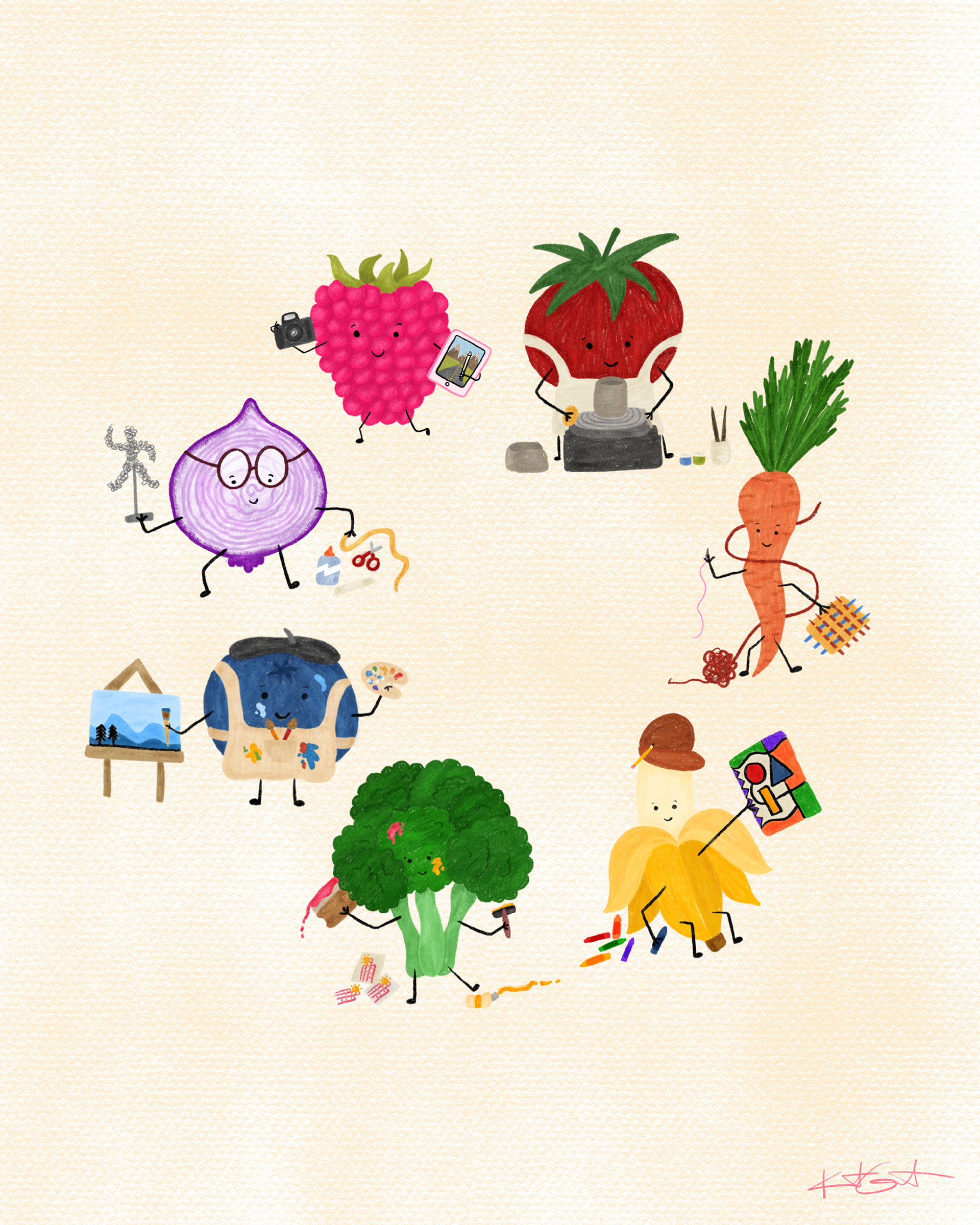 Project: I get by with a little help from my (food) friends! 😋 Let me introduce you to my Art Class Mascots. For those who don't know, I'm an elementary art teacher by day. My theme for my art room involves food, of course, and I had the idea to create mascots based on the mediums we use in our art projects: ceramics, fiber, mixed media, printmaking, painting + drawing, sculpture, and digital.