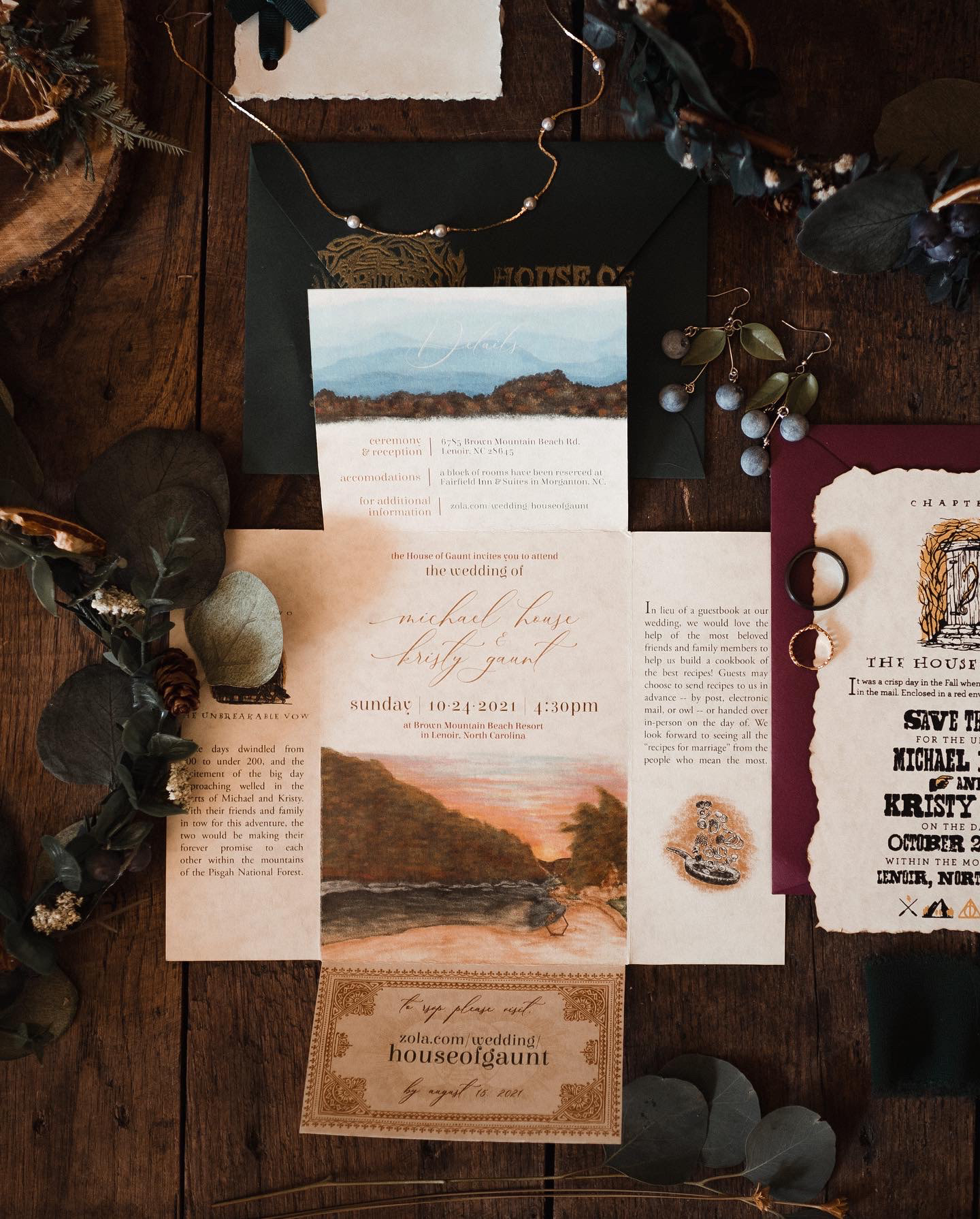 • For our Save the Date, I digitally mocked up all elements — created my own version of the House of Gaunt from Harry Potter, and then drew out some type that looked like it had been letterpressed (since Michael & I’s first date included him helping me print my final project for 5 hours in the letterpress lab at FSU, ha!) At the bottom, I drew our 5 icons that represented us that included HP imagery.