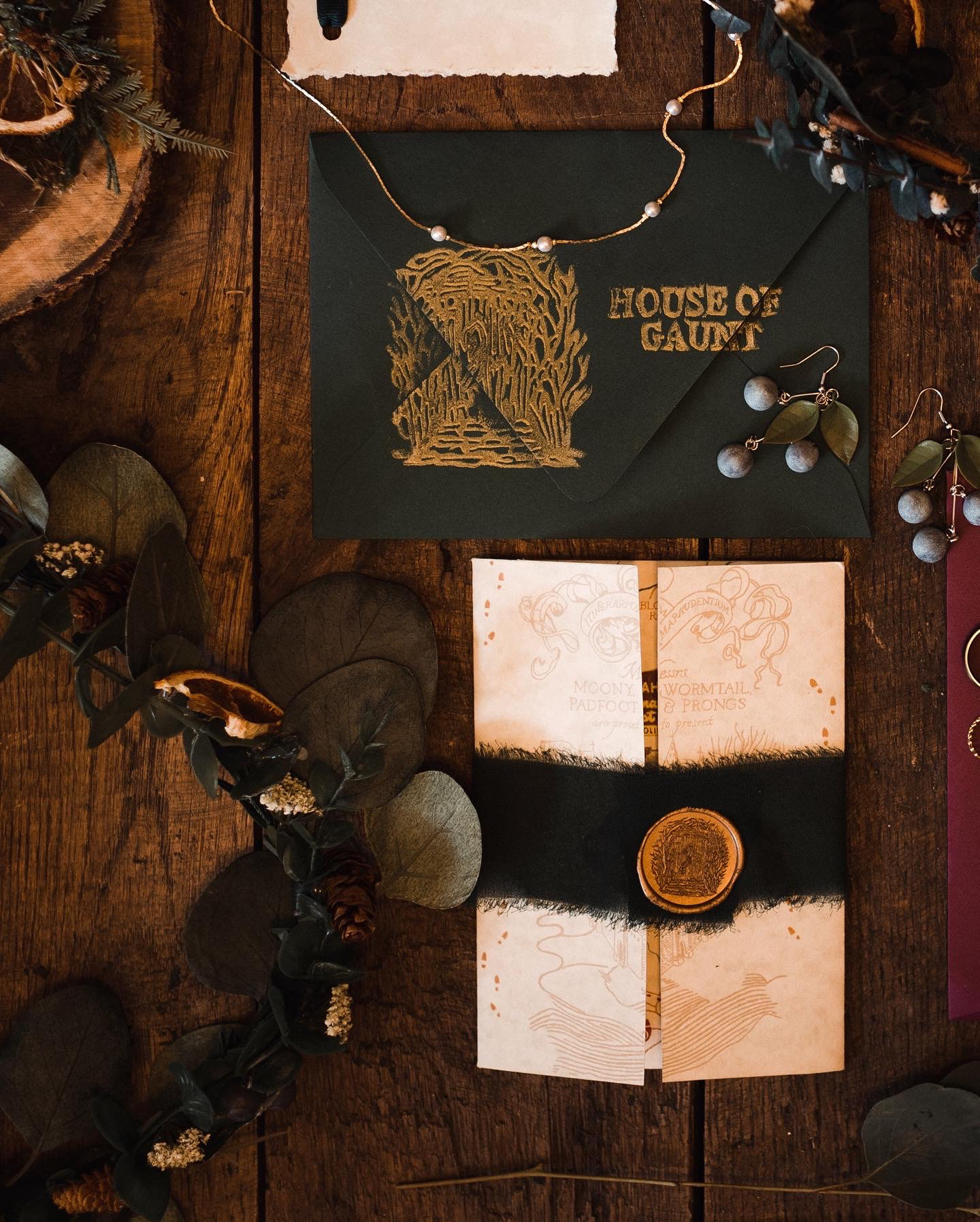 • I carved the House of Gaunt icon into a rubber block, inked it with golden, and hand-stamped each of our Forest Green envelopes.