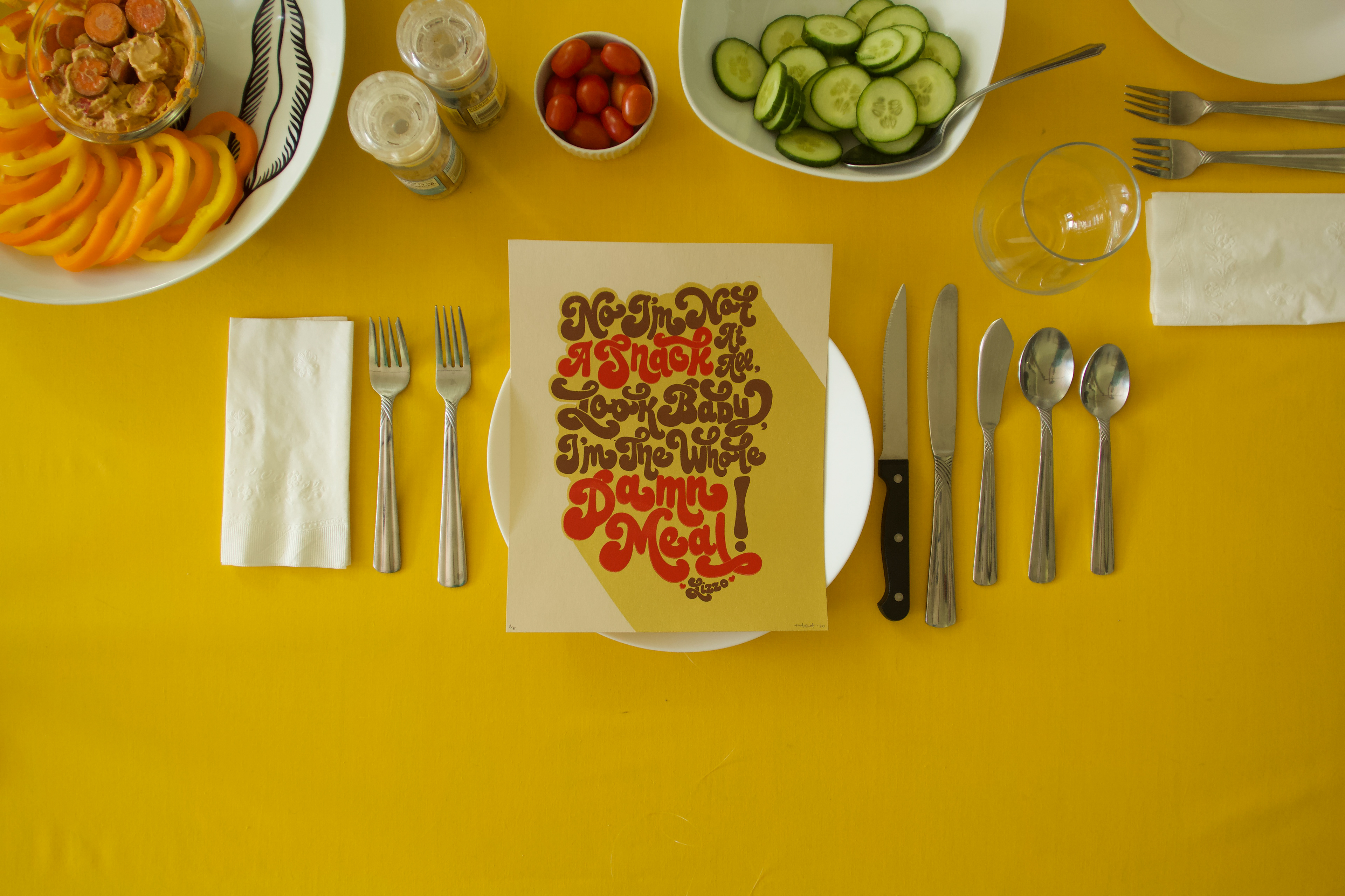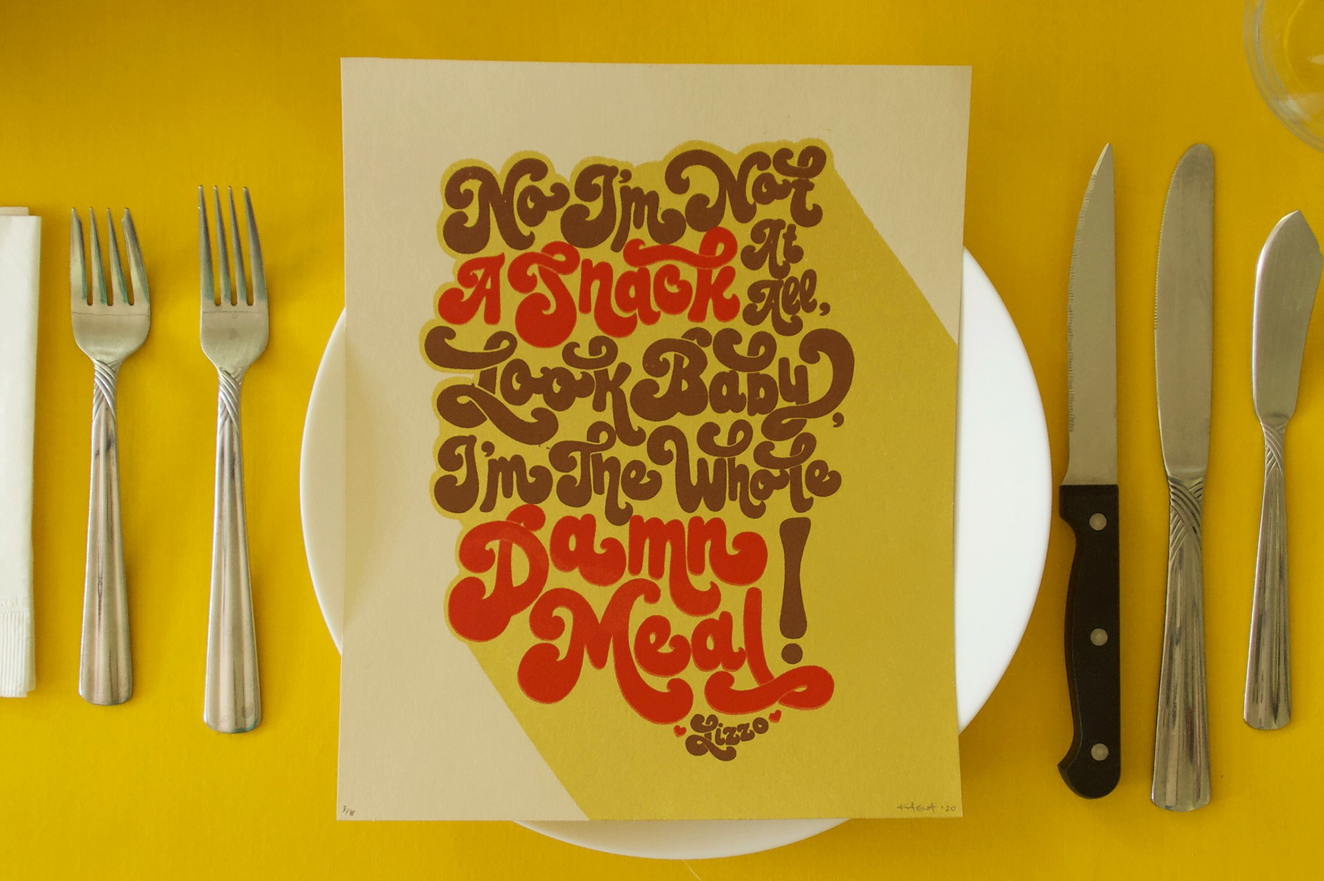 Project: DINNER IS SERVED! “No, I’m not a snack at all. Look baby, I’m the whole damn meal.” 3-layer screen-print, 8x10, original lettering on metallic gold ink. Each layer is printed by hand in my steamy & dreamy FL garage.